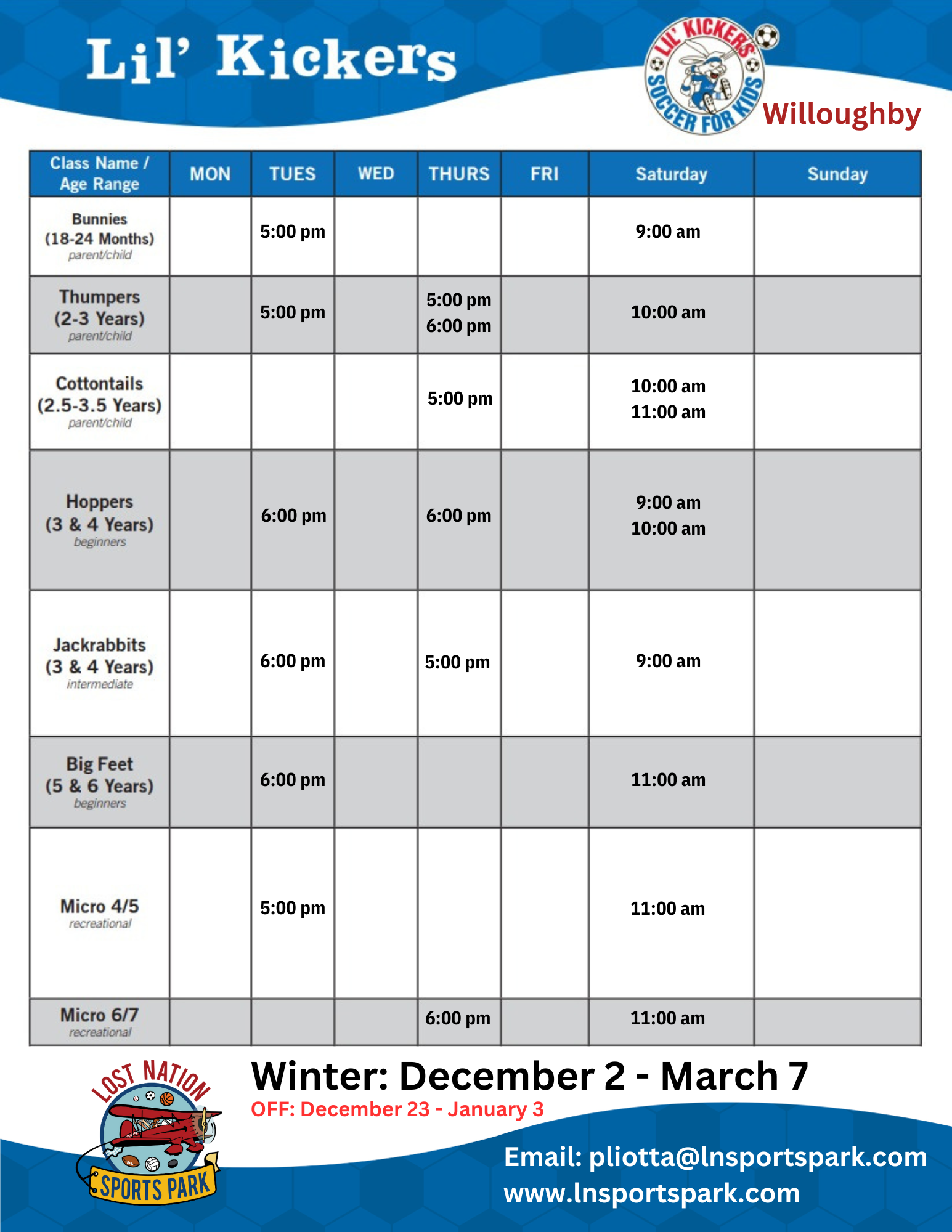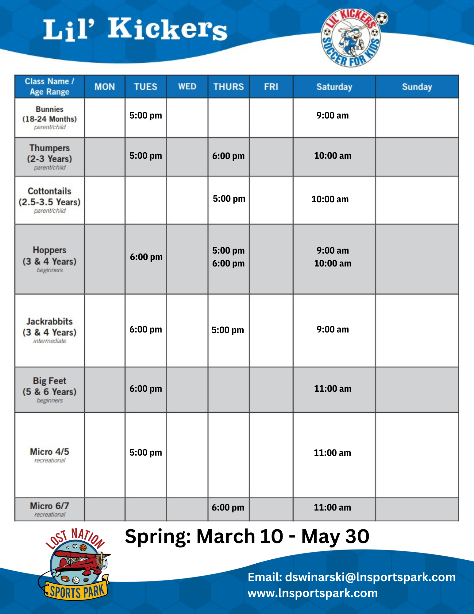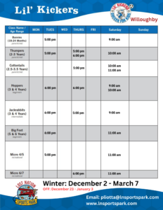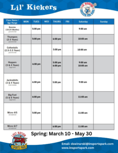 Cost: $18/week + an annual registration fee which includes your Lil’ Kickers Jersey!